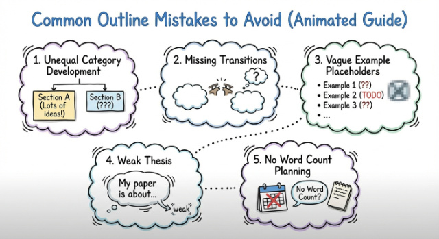Fix: Write your complete thesis in outline stage: "[Topic] can be classified by [organizing principle] into [#] types: [all categories named]." Your thesis guides the entire outline.