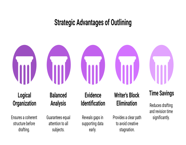 1. Ensures Logical Organization Before Drafting: Discovering organizational problems after writing 1,000 words requires extensive revision or complete rewriting. Discovering the same problems during outlining requires simply reorganizing bullet points—taking minutes rather than hours.
