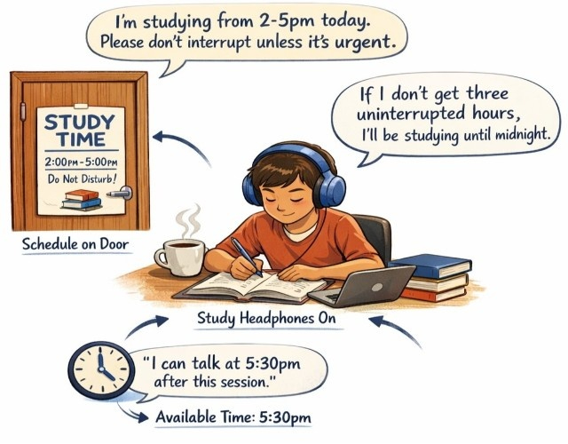 - Explain consequences: "I need three uninterrupted hours, or I'll be studying until midnight".