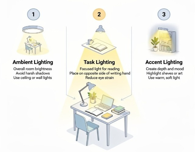 Combine three lighting layers: natural light when available, overhead ambient lighting (500+ lux), and focused task lighting (1000 lux) directed at your work surface from the side to prevent shadows. This multi-layer approach prevents eye strain, reduces fatigue, and maintains alertness during extended study sessions.