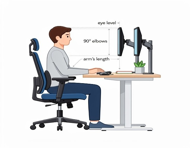 - Use ergonomic seating supporting natural spine curve with proper desk height allowing feet flat and arms at 90 degrees.