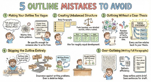 Fix: Keep outline points brief. Use keywords, short phrases, and abbreviated notes. Save full sentence writing for your actual draft.