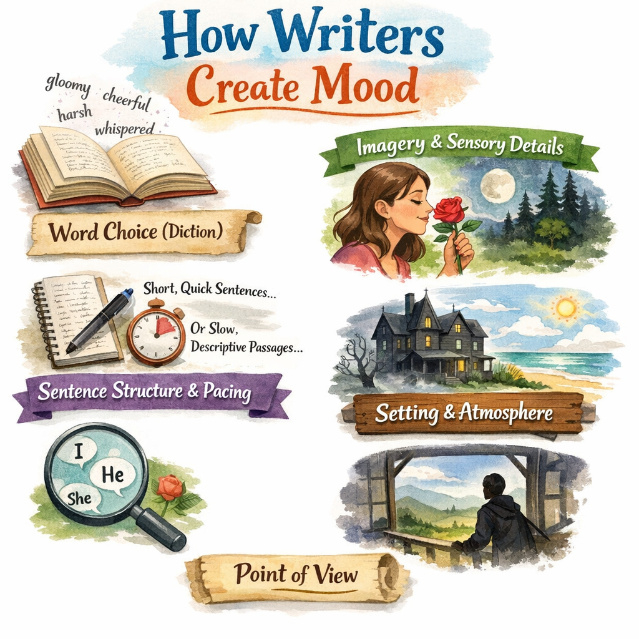 Mood is the emotional atmosphere writers create through word choice, imagery, pacing, and setting. It shapes how readers experience the story making them feel tense, hopeful, melancholic, or triumphant.