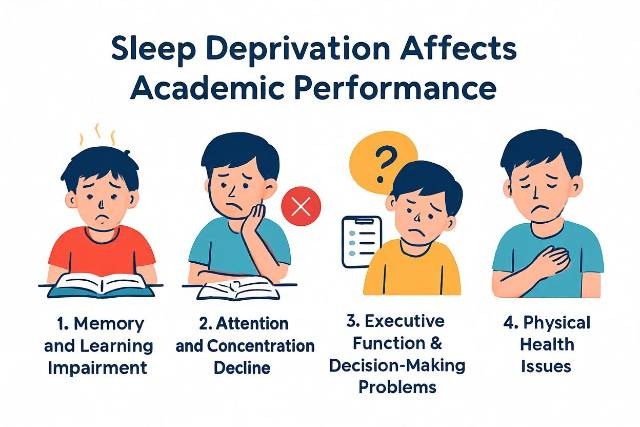 Sleep deprivation impairs academic performance by reducing memory consolidation where information studied doesn't transfer from short-term to long-term memory making retention 25-40% worse after inadequate sleep, decreasing attention span and focus causing 30-50% more errors on tasks requiring sustained concentration, impairing executive function reducing ability to plan, organize, and make good decisions, slowing information processing speed where sleep-deprived students take 20-35% longer to complete cognitive tasks, and weakening emotional regulation increasing impulsive decisions and stress responses that interfere with learning.