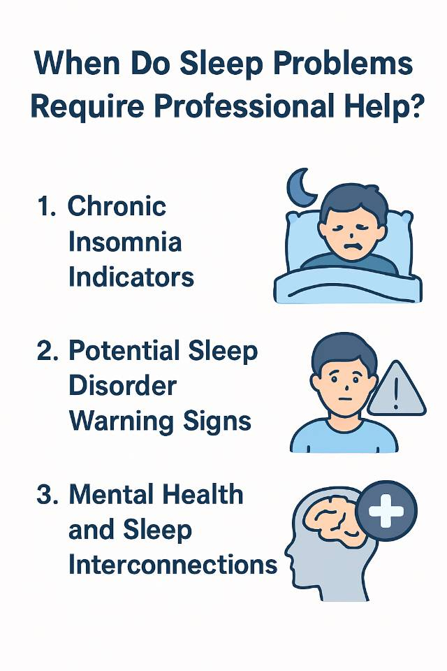- Sleep problems lasting more than 3-4 weeks despite good sleep hygiene require professional evaluation for potential sleep disorders or underlying mental health conditions