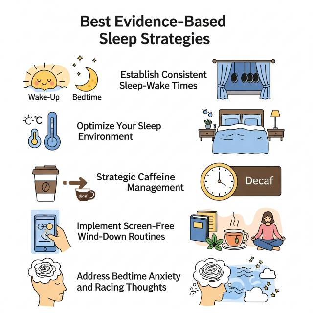 - Evidence-based sleep strategies include consistent sleep-wake times within 30-minute daily windows, cool dark quiet sleeping environments, 2 PM caffeine cutoff, and 60-90 minute screen-free wind-down periods