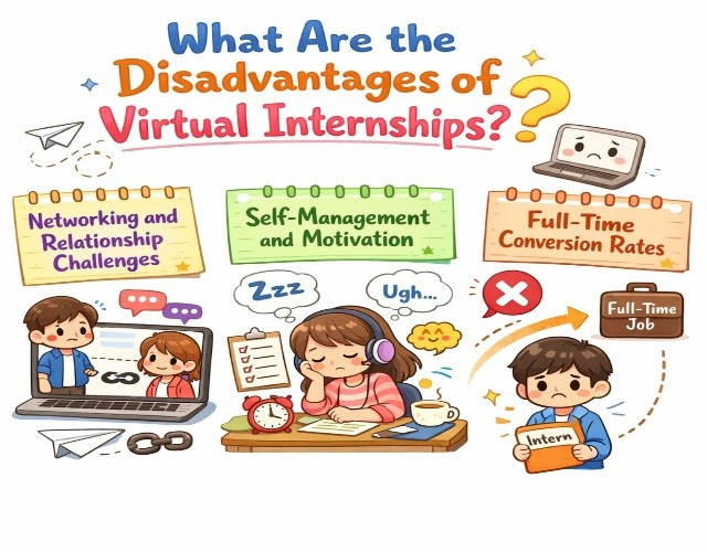 Virtual internships face disadvantages including reduced networking opportunities (42% fewer spontaneous interactions), less immersive mentorship requiring more intentional communication, greater self motivation challenges without office structure, limited exposure to company culture and professional environment, technology and connectivity issues creating barriers, social isolation and reduced team bonding, and lower full-time conversion rates (58% versus 67% for traditional internships).